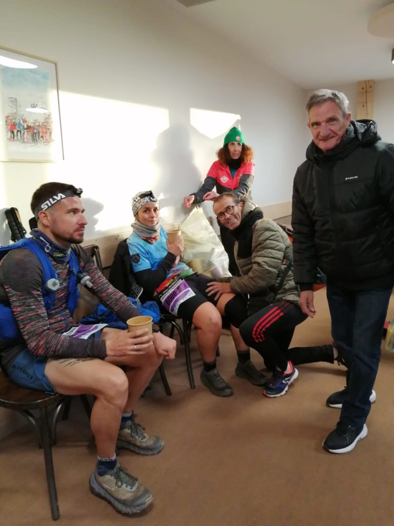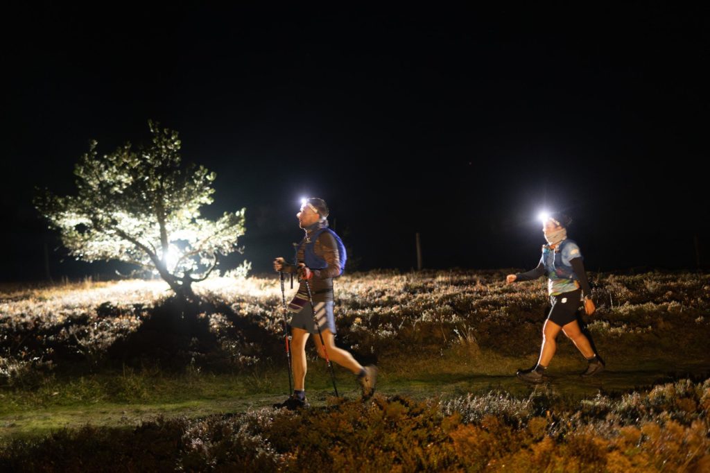 Solène tient une allure plus soutenue que ce que j’avais anticipé au départ. Tant mieux, autant profiter des deux petites heures diurnes qu’il nous reste avant de mettres les frontales pour affronter la première longue nuit. On aura la chance malgré tout de traverser au crépuscule le parc d’un magnifique château dans la commune de Vollore. On atteint à bonne allure le premier ravitaillement au 19ème kilomètre sans problèmes et on a la bonne surprise de faire face à des ravitaillements qui semblent bien copieux. La nuit est bien fraiche maintenant et il est temps de bien s’équiper contre le froid. On mange beaucoup plus que d’habitude, la thermorégulation nous fait dépenser davantage de calories que chez nous. Je calme une certaine euphorie de Solène, qui vole en ce début de parcours. Mais l’objectif est encore bien loin.